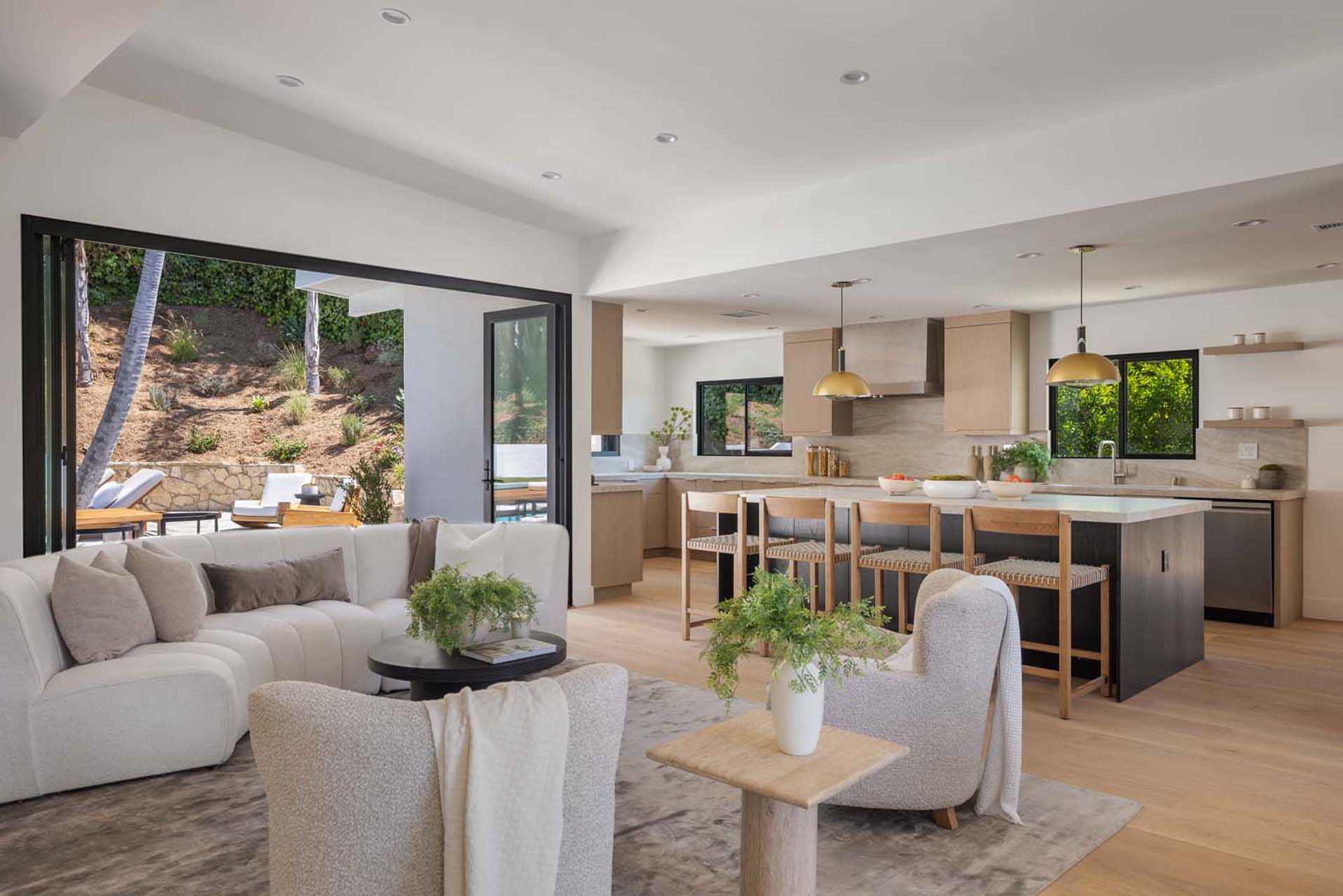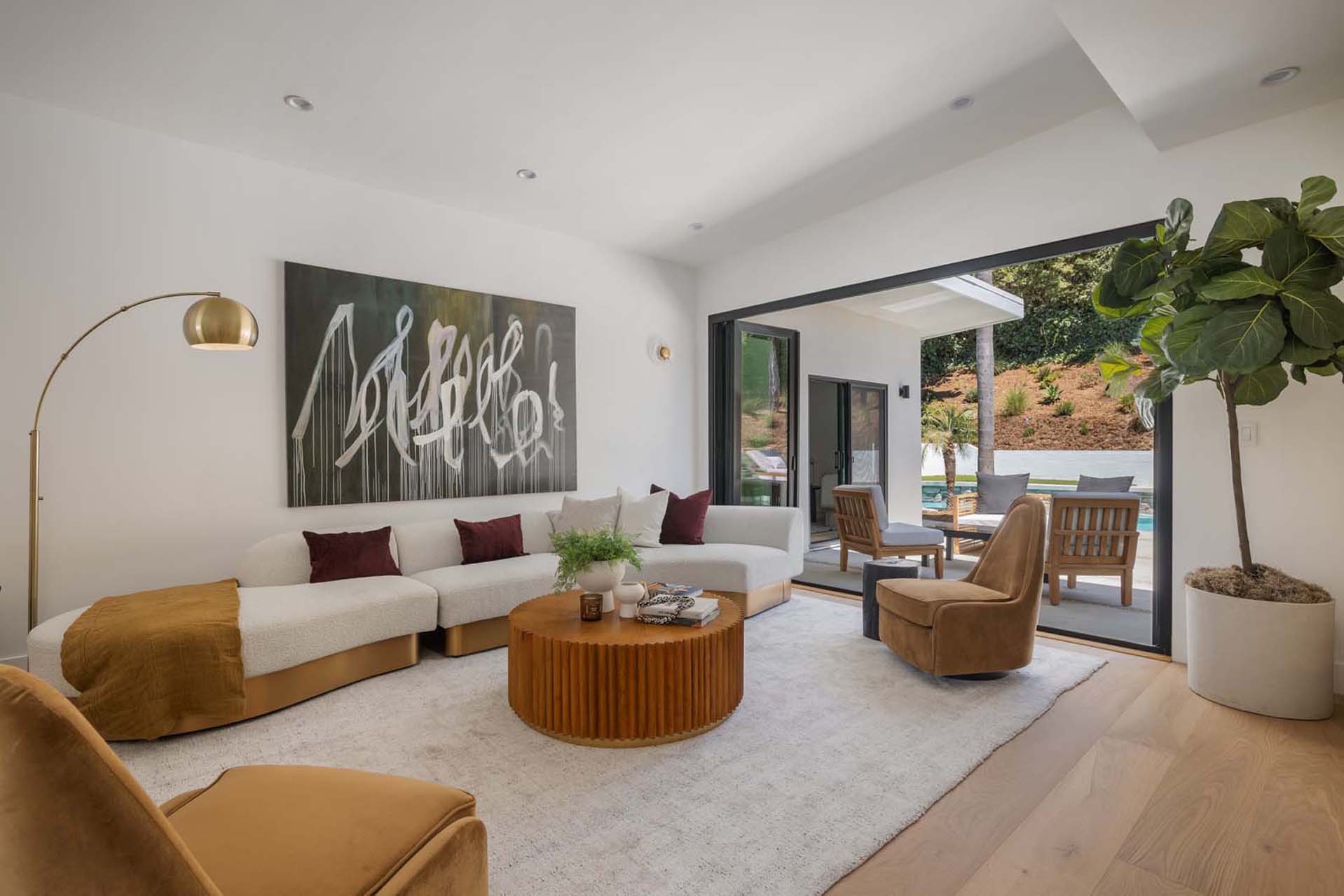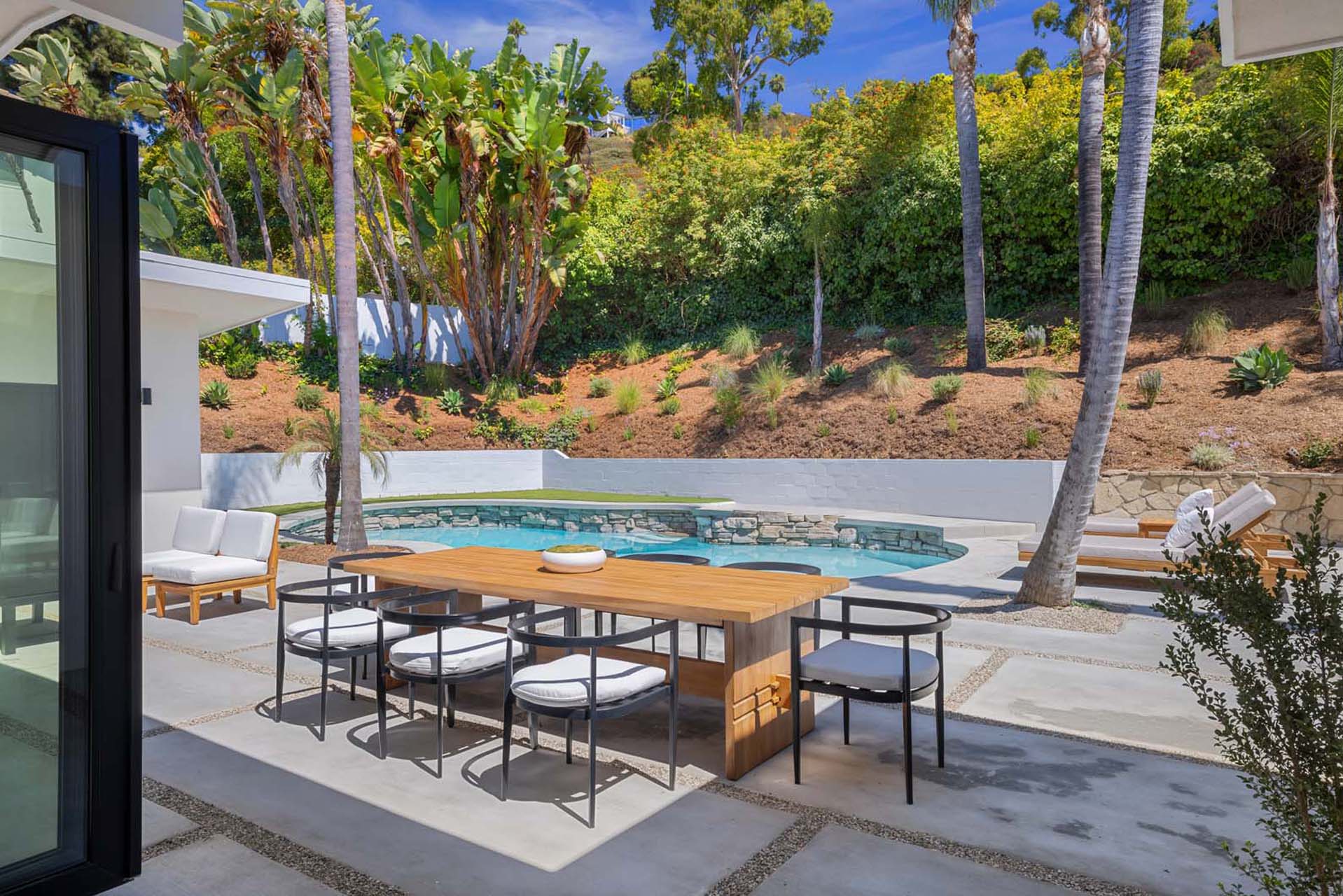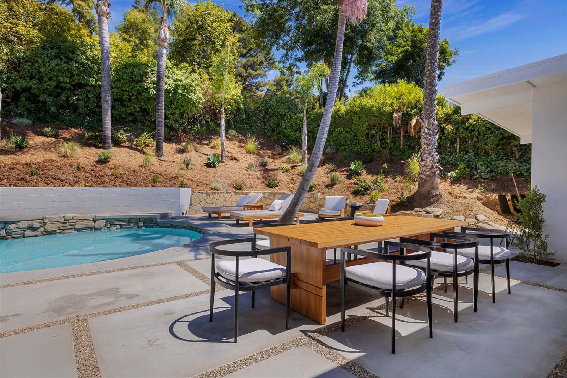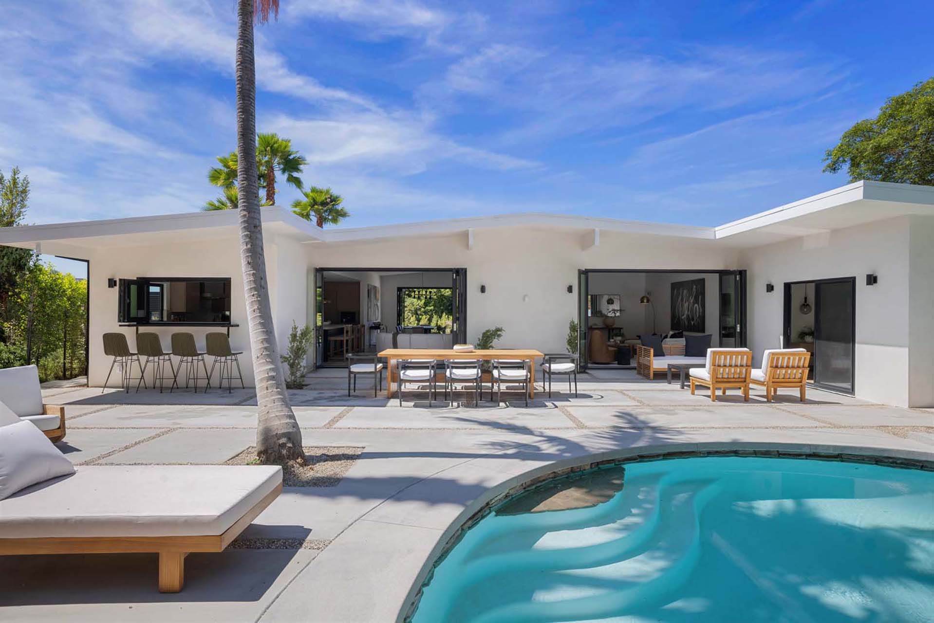 Brand new exceptional remodel of a circa 1963 Mid-Century, 13535 Bayliss Road evokes the relaxed sophistication of a pitch-perfect Palm Springs retreat in the heart of Brentwood. With modern architectural lines and an expansive single-story footprint, this sun-soaked residence blends the timeless integrity of Mid-Century Modern design with the elegance and comfort of modern luxury. Walls of folding glass doors frame views of the sparkling pool and greenery, transforming the home into a chill weekend getaway, perfect for lounging under the sun, dining al fresco, or evening gatherings under the stars. Inside, elegant materials meet luxury upgrades in a refined chef’s kitchen with Miele appliances, custom cabinetry, and fine Italian porcelain center island and countertop surfaces. Airy primary retreat with ensuite bath accented with Cocci Sicilian Bianco stone, capturing the serenity of a resort-inspired spa. Secondary bedroom baths enhanced with terrazzo tile flooring, honoring the home’s heritage. Inviting European white oak floors throughout the open living spaces. Select lighting by Viro and Aerin Lauder complete the interior spaces with a refined glow, shifting from bright and airy by day to soft and atmospheric by night. A rare opportunity to own an artfully designed Brentwood oasis offering unparalleled amenities and comfort in a private, serene setting.